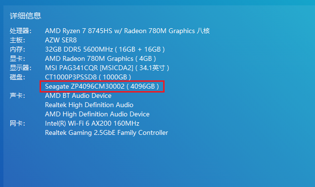 🔺安装好之后可以看到小主机准确的识别到硬盘的标识和容量,兼容性没有问题。这里有个小细节,大家可以看到它显示的容量为4096GB,而不是其它一些厂商取整数的4000GB,就凭这一点就说明希捷还是很厚道的。