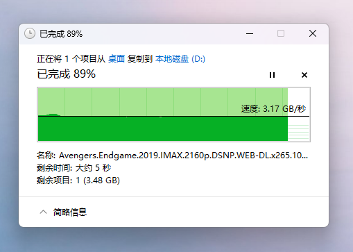 🔺最后来一个日常数据传输对拷测试,在测试一个30+GB的影视文件传输中,可以看到它的速度一直稳定在3.2GB/s左右,非常给力了。