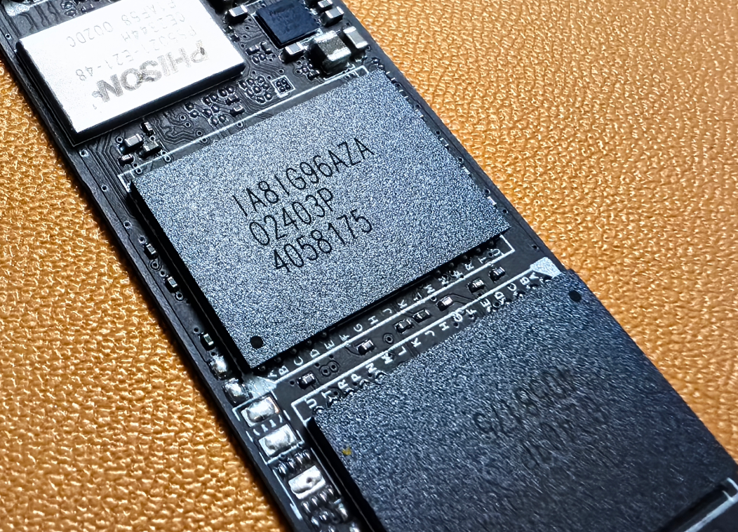 🔺撕开兼顾散热的外部贴纸看看里面原件的构造,可以看到它的内存颗粒为显示的标识为IA8IG96AZA,经查询它是来自镁光的3D NAND Flash,品质过硬。