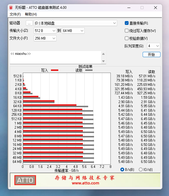 🔺在ATTO Disk Benchmark 基准测试中,将队列深度设置为4,它的最高读取速度可以达到5.49GB/s,而写入速度竟然可以达到 6.50GB/s,也表现出了很不错的传输速率。同时我们还能看出,当文件超过16KB的时候基本就达到了1.43GB/s的写入速度与1.59GB/s的读取速度,在128K的时候几乎就能释放最大性能,再次说明它高IOPS的优势!