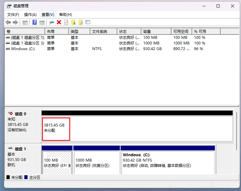 🔺新硬盘在使用前需要再电脑的磁盘管理对它初始化。在这里我们可以看到这里显示的未分配容量为3815.45GB,这里可以看出希捷在硬盘容量方面是真正做到了足容不虚标,因为我见过其它某些硬盘厂商钻Windows电脑计量方式不同的空子,标称4TB,实际可用仅为3726GB,虽说也满足4TB的条件,但是相比希捷这款硬盘要少88GB的容量。
