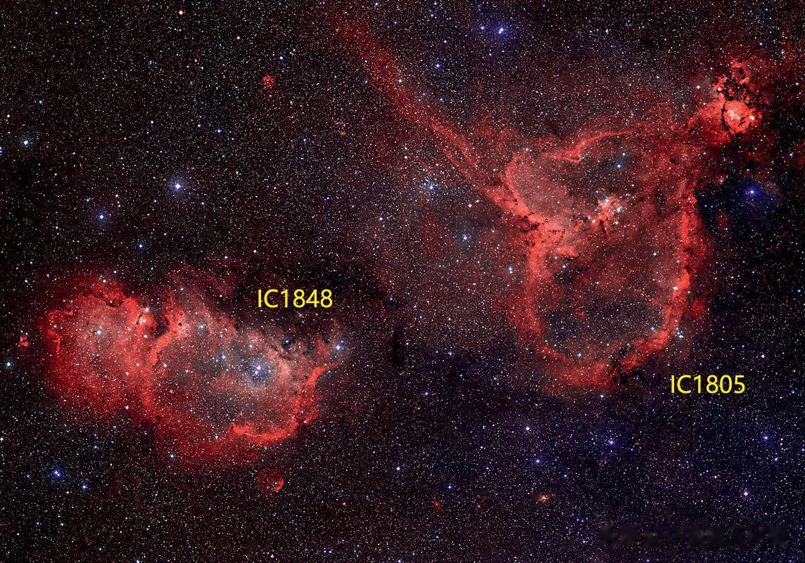 同NGC7293类似,IC1805和IC1848也是充满魔幻色彩的星云,分别被称为心脏星云和灵魂星云。二者彼此接壤,同属于发射星云,距离我们约7500光年,位于银河系英仙座旋臂上,从地球上观测位于仙后座方向。IC1805由于其类似心脏的形态而得名,位于星云核心的一团大质量恒星发出的辐射使得周围的氢发生电离,从而显现出红色的光芒。IC1848则是被内部的数个小规模疏散星团照亮。想观测到这对星云最好采用摄影的方法,由于人眼对红色并不敏感,所以即使借助望远镜目视观测也很难看到。