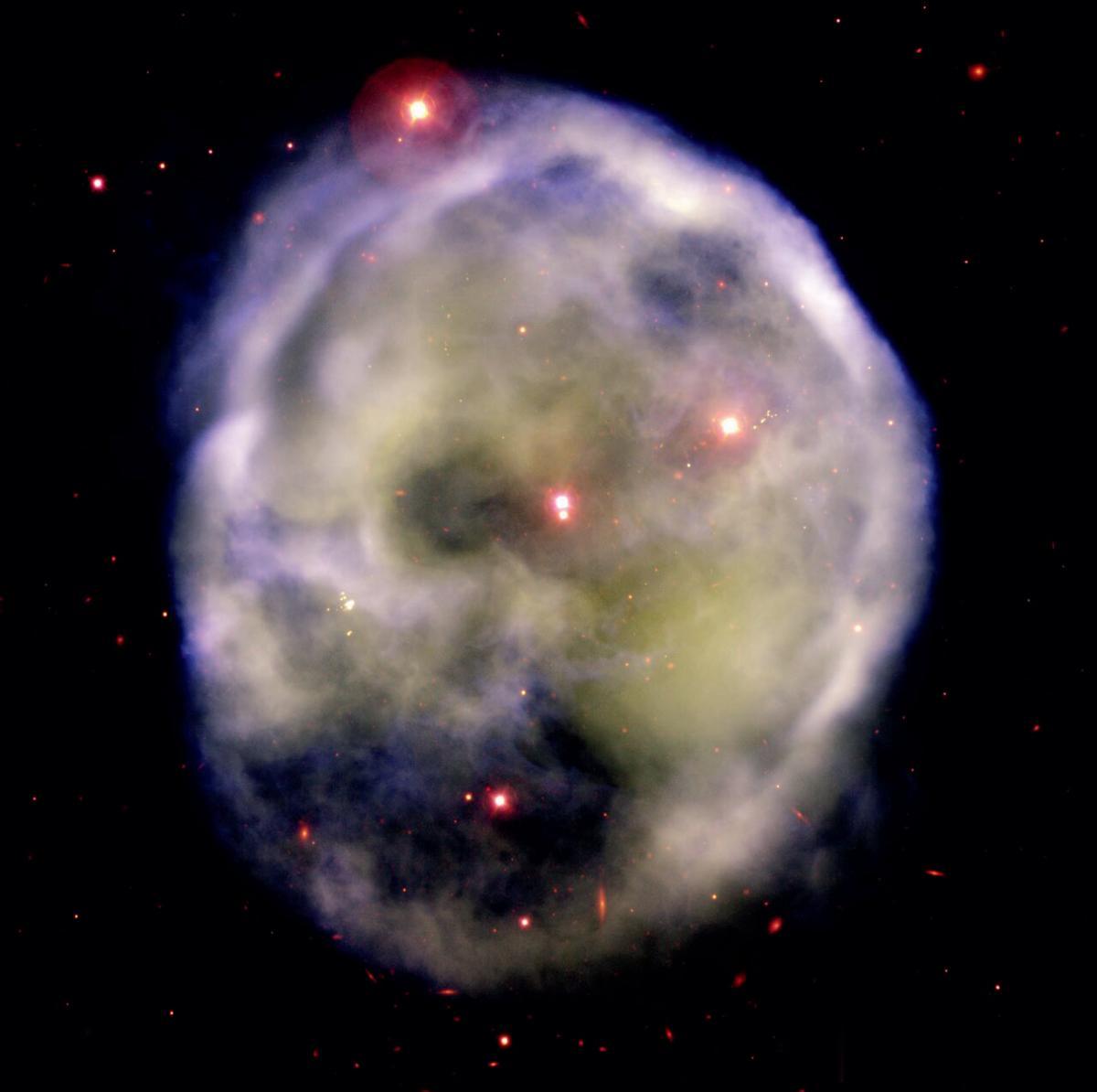 位于鲸鱼座的行星状星云NGC246的绰号为骷髅头星云,这当然是得名于它在照片中的形态。不过,实际上这片星云也确实围绕在距离我们约1600光年外一颗垂死恒星的周围。这片星云曾经是一颗类似太阳恒星的外层大气,这颗恒星正在进入生命的最后阶段,最终将会演变成一颗致密而炽热的白矮星。被恒星抛出的外层大气与周围物质发生相互作用产生的光芒被赫歇尔于1785年首先发现。