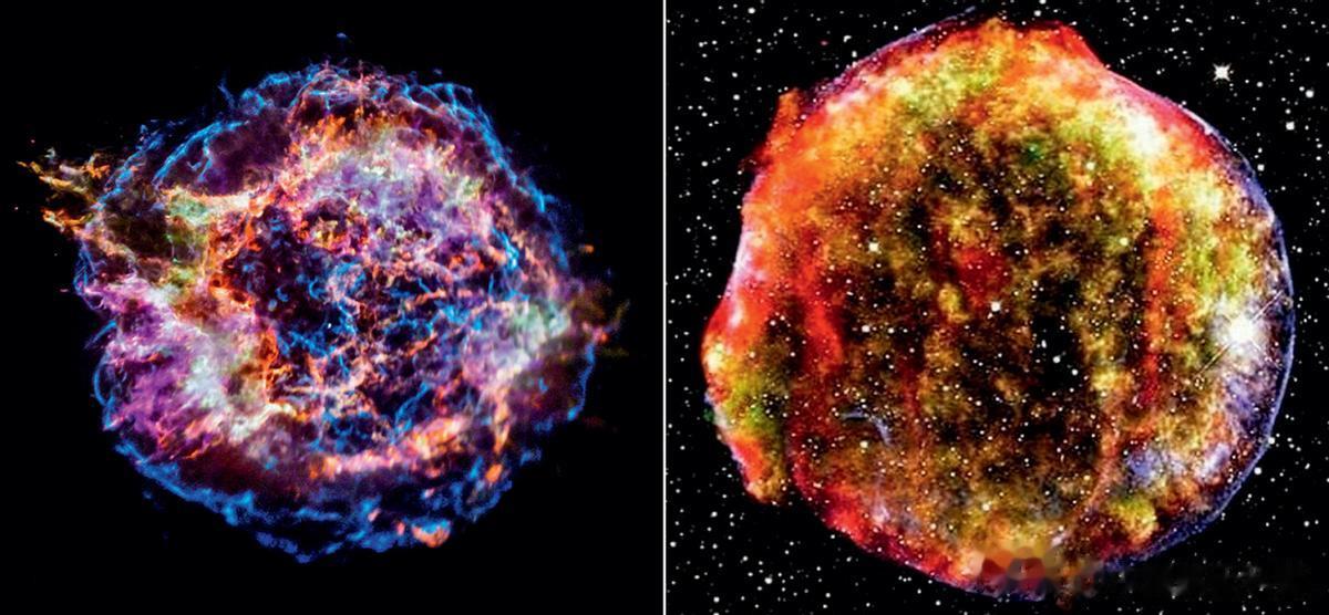 位于仙后座天区内有两个著名的超新星遗迹——仙后座A和仙后座B。仙后座A是人类发现的太阳系以外的最亮射电源,据估计这颗超新星距离我们约1.1万光年,它爆发产生的光大约于300年前抵达地球,但历史上并没有关于这颗超新星爆发的记载。仙后座B却是历史上极少数几颗能够被肉眼看到的超新星爆发之一,1572年,丹麦天文学家第谷观测到了这颗超新星的爆发,历史上也被称为第谷超新星。图为仙后座A(左)和仙后座B的多波段伪彩色图像。