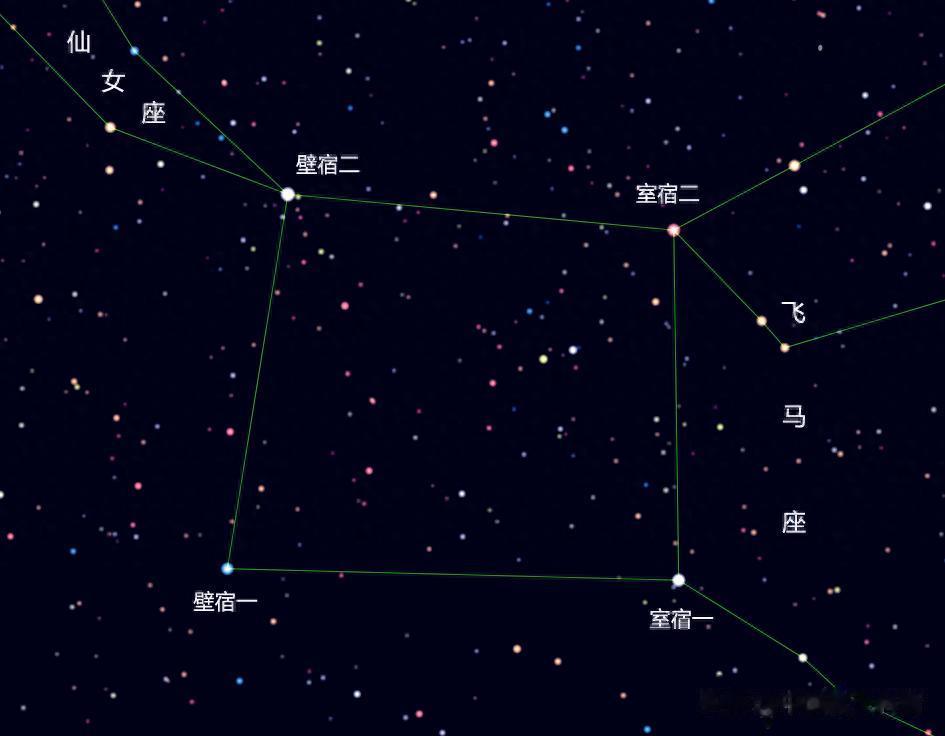秋季夜空的标志是由飞马座和仙女座四颗恒星组成的秋季四边形。由于这四颗恒星的亮度均只有2等左右,与春季大三角、夏季大三角以及冬季六边形相比,秋季四边形稍显暗淡。四边形由飞马座的室宿一、室宿二和壁宿一,以及仙女座的壁宿二组成。其中壁宿一、壁宿二与室宿一均为发着白色或者淡蓝色光芒的大质量恒星,只有位于四边形西北方的室宿二显出浅浅的红色。四颗星中最亮的是位于东北方隶属仙女座的壁宿二,它的亮度为2.1等。