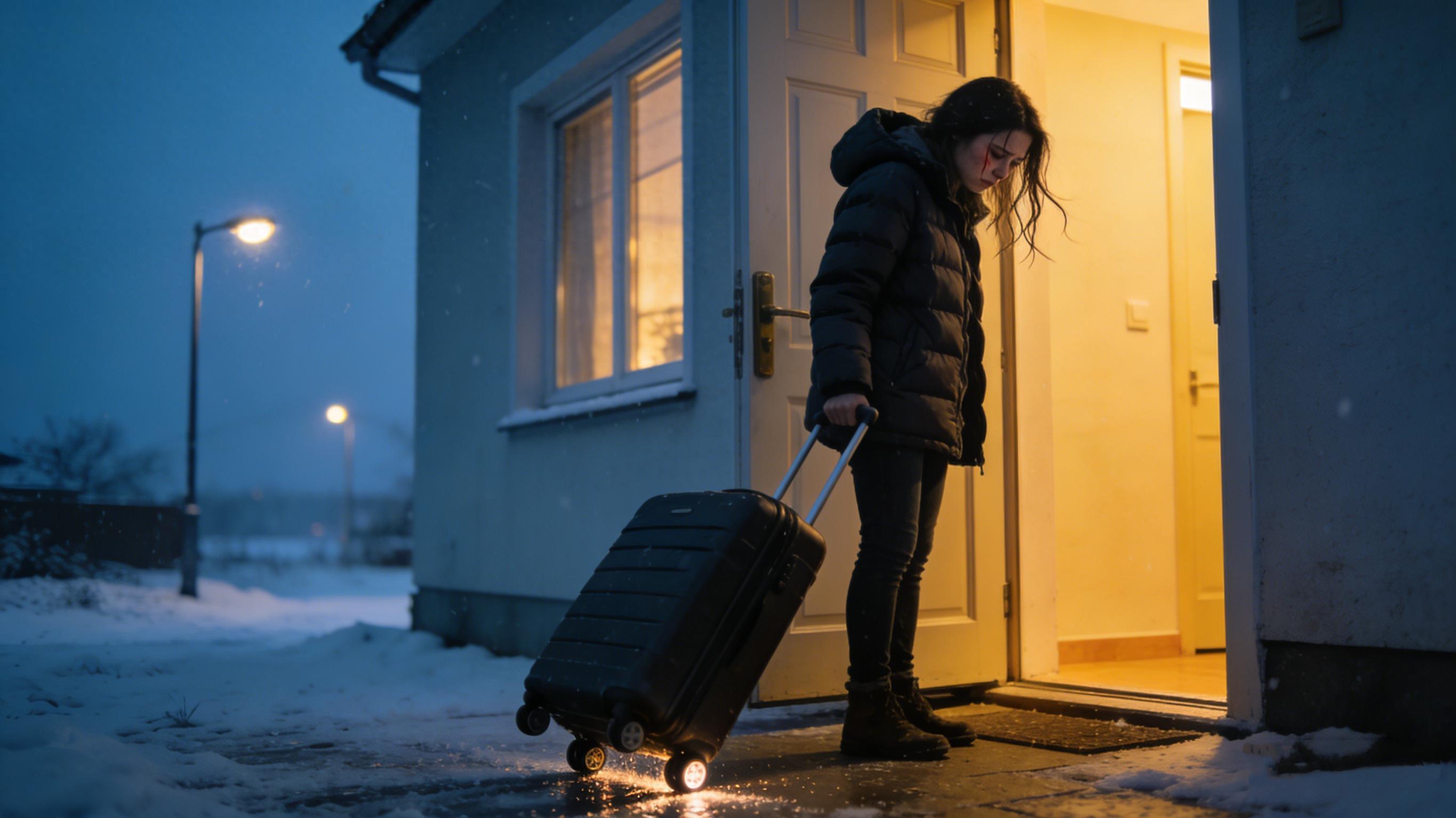 女子拖着行李箱站在家门口