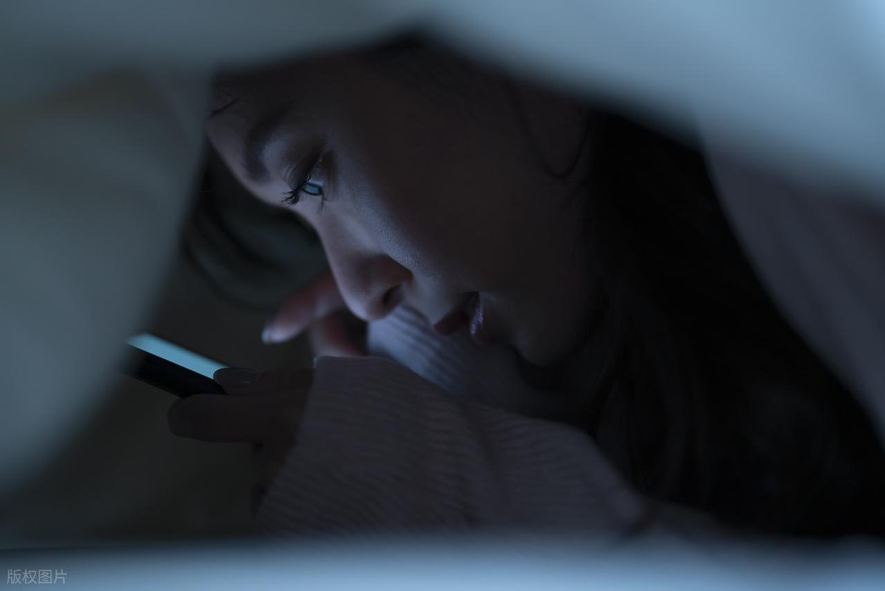 关灯熬夜玩手机的女性