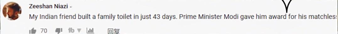 之前提到的那个150万播放的视频,很多评论都在夸中国速度。比如这个就在说“我的印度朋友用43天修好家里的厕所,为此,莫迪总理居然给他颁奖”!