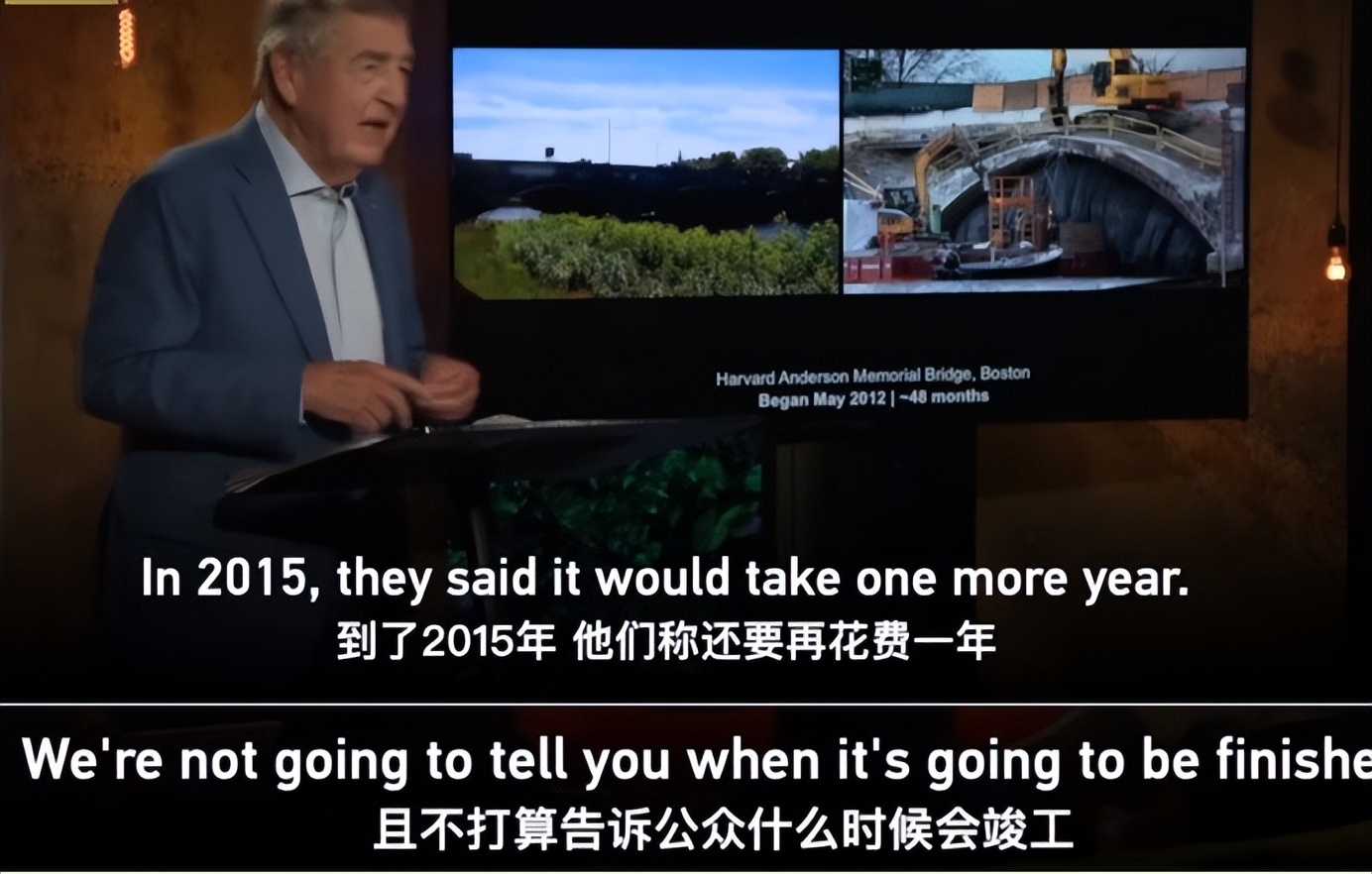 大伙儿都来瞅瞅啊,就这破桥,要两年!结果呢,花费超出预算的3倍,工期却一推再推,到2015年都没修完,而且也不打算公开说明到底啥时候才能竣工。你说这事儿办的,丢不丢人啊!