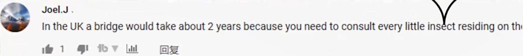 还有一个说“在英国,建修桥也需要2年,而且还要问过工地周围所有小昆虫的意见,才能拿到施工证”。