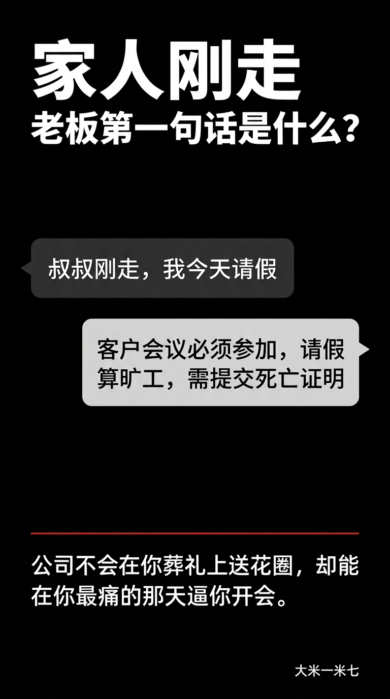 主管的回复来了:客户会议你必须参加。请假算旷工。如果要休,提交死亡证明。