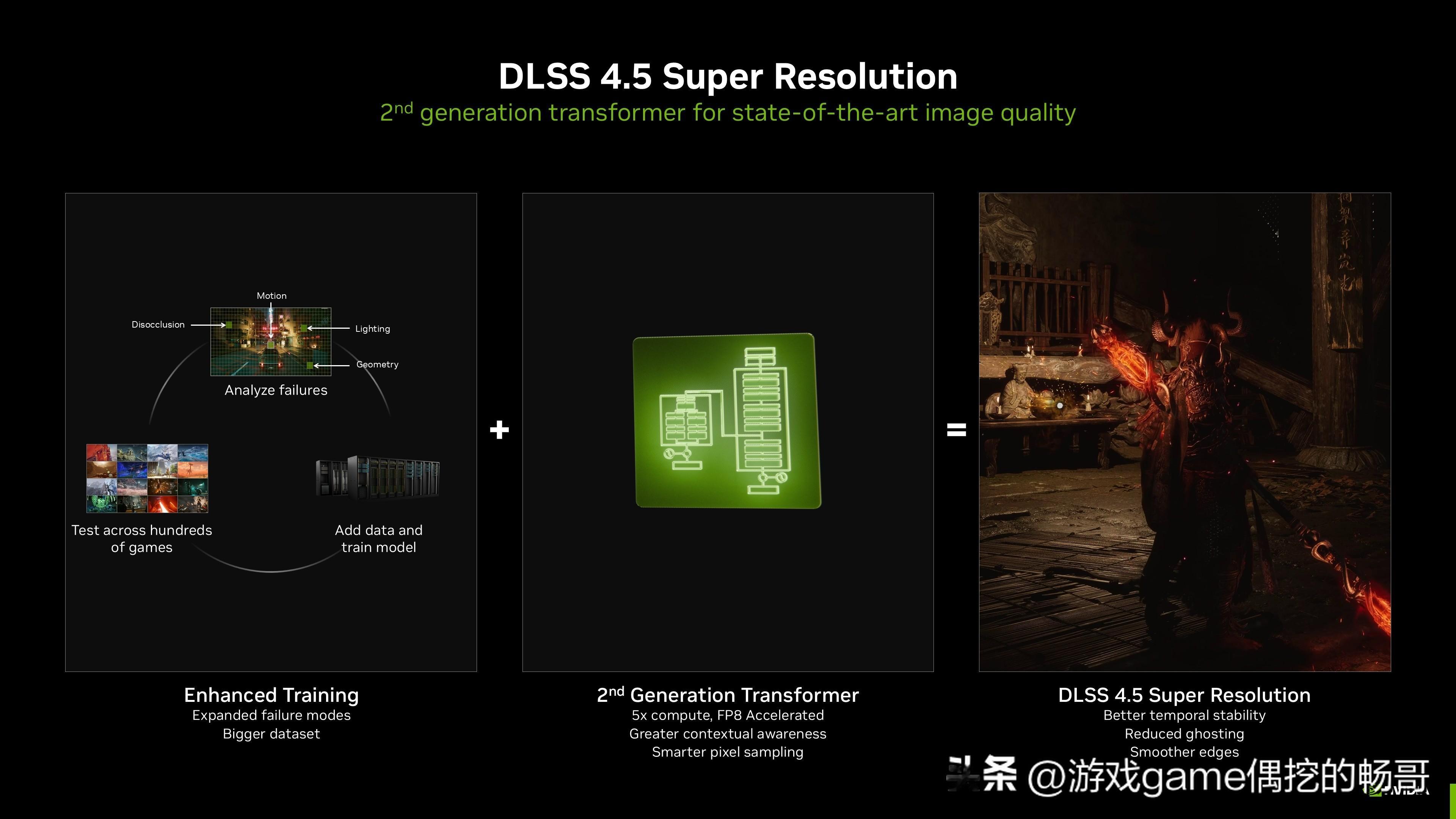 最核心的升级当属第二代Transformer超分模型。可能有人听不懂"Transformer",你就理解为显卡的"AI大脑"升级了。