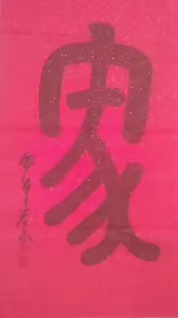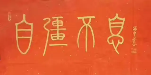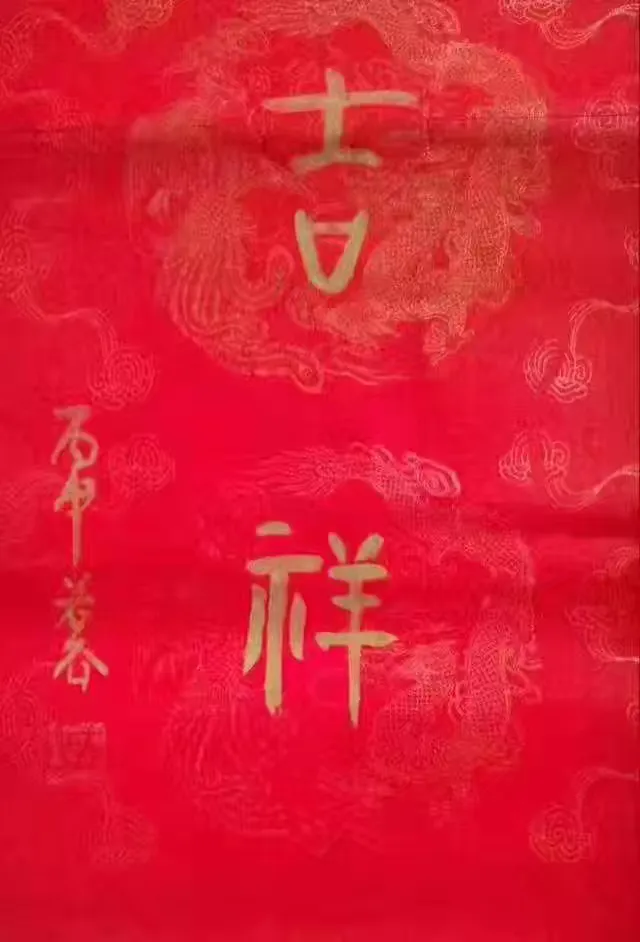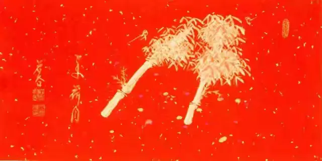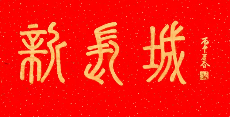 笔法古朴端庄,金粉在洒金红纸上熠熠生辉,尽显金石韵味与喜庆气象。