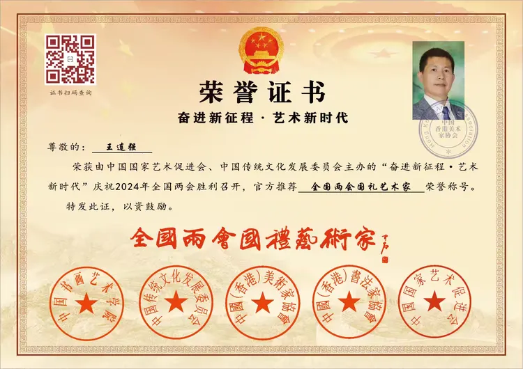 2020至2022年,连续获评全国两会重点推荐“人民艺术家”“德艺双馨艺术家”,受聘中国国艺人民书画院院士、孔子美术馆客座教授、2022北京冬奥会艺术形象大使。2023年被世界文联授予庆祝新中国成立74周年“德艺双馨艺术家”称号。2024年当选全国两会“国礼艺术家”,受聘CCTV央媒文化特聘艺术顾问。