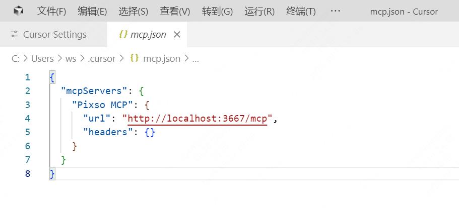 { "mcpServers": { "Pixso MCP": { "url": "http://localhost:3667/mcp", "headers":{} } } }