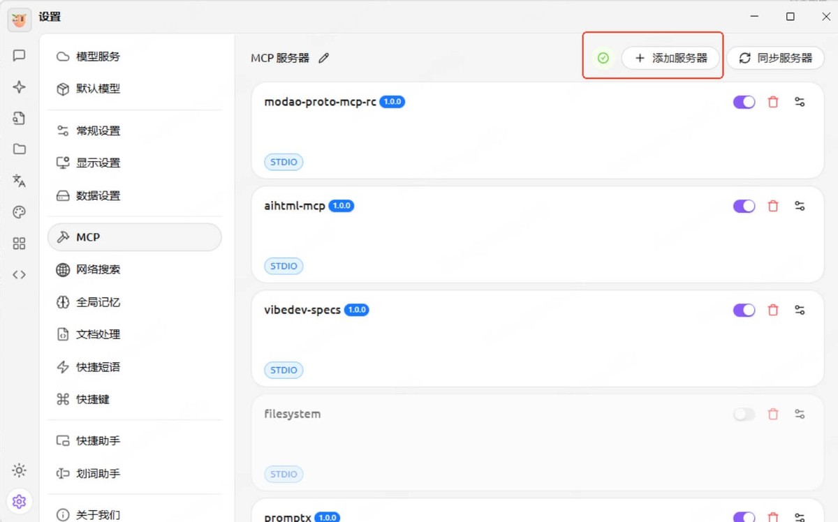 打开Cherry Studio应用,进入MCP配置页面,点击“添加 MCP 服务器”。接着,选择从JSON导入的方式,然后粘贴墨刀官方提供的MCP JSON配置代码。完成后点击“保存”,并记得开启 MCP 开关,让系统正式加载配置。