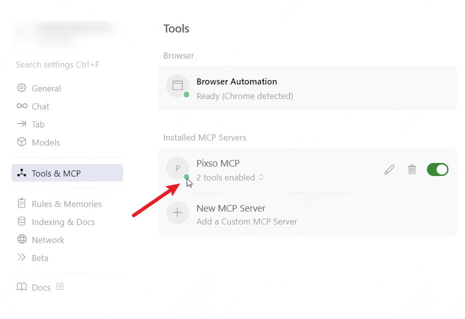 回到Cursor的Tools & MCP配置页,确认刚添加的Pixso MCP右下角的圆点为绿色,代表本地的MCP服务可正常运行。