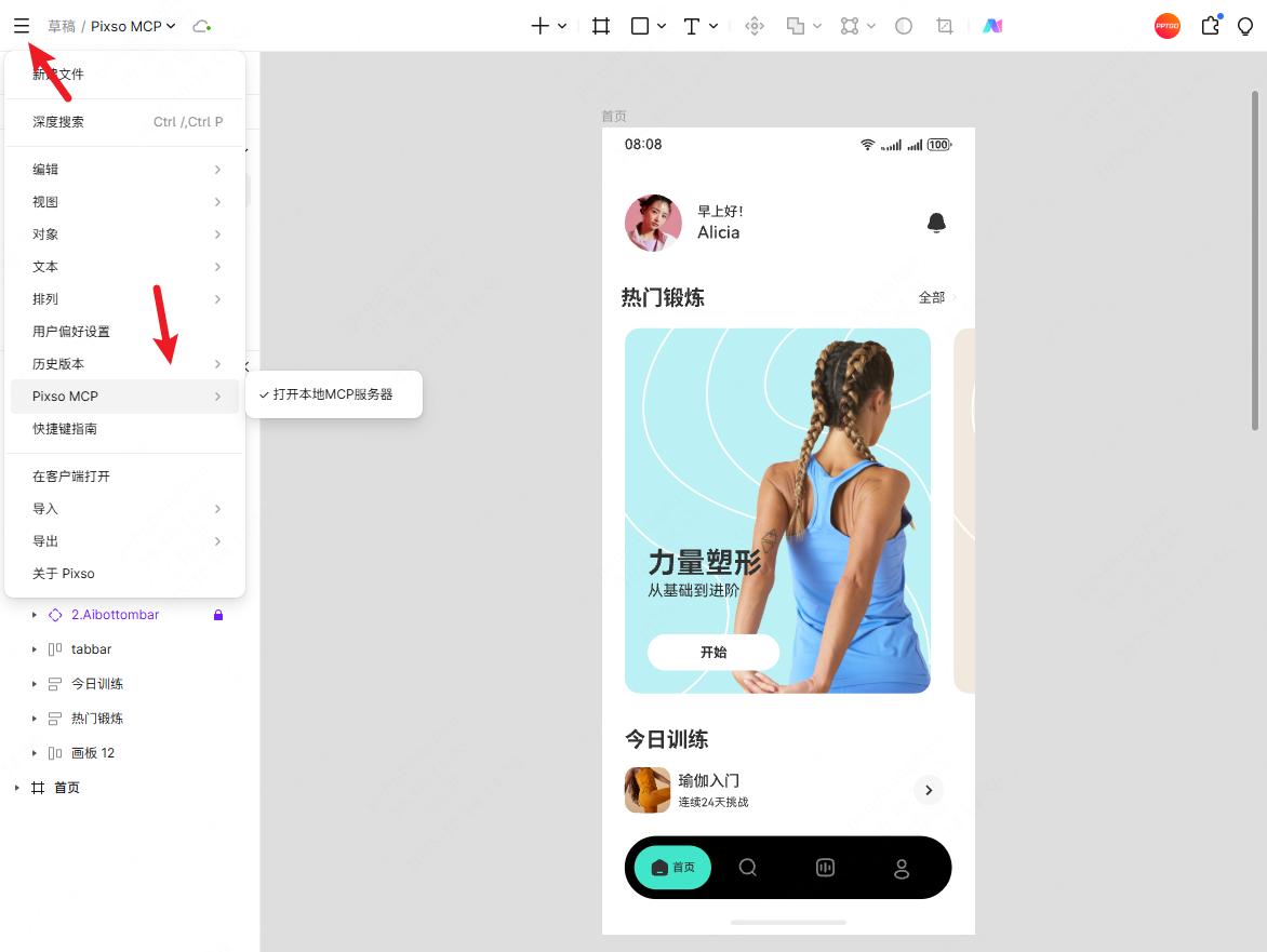 ② 打开本地Pixso MCP服务器在打开的Pixso设计文件,点击左上角的文件菜单,选择Pixso MCP > 打开本地MCP服务器。