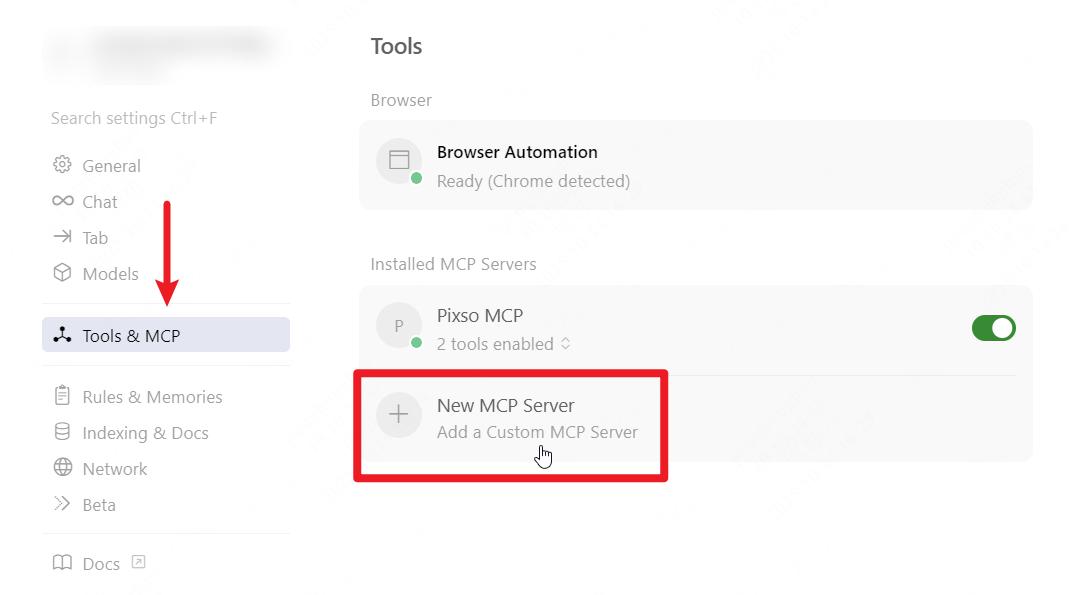 在打开的Cursor设置页面,找到MCP服务器的配置项Tools & MCP。点击右侧的New MCP Server,会打开Cursor MCP的配置页面,将Pixso MCP服务器的地址添加进去。