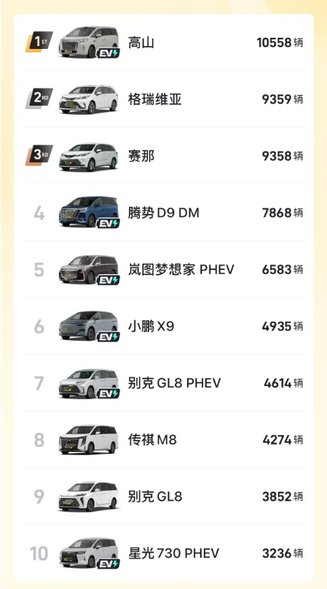 丰田旗下两款姊妹MPV车型形成“双子星”联动,成功包揽亚军与季军。其中第二名格瑞维亚12月销量9359辆,第三名赛那销量9358辆,两者销量仅差1辆,竞争异常激烈。