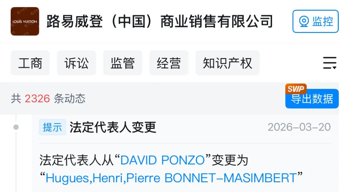 2026年,LV中国核心管理层面发生改变。天眼查App显示,2026年3月20日,LV中国完成工商信息变更,原日默瓦全球CEO Hugues Bonnet-Masimbert空降出任LV中国董事长。