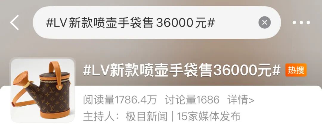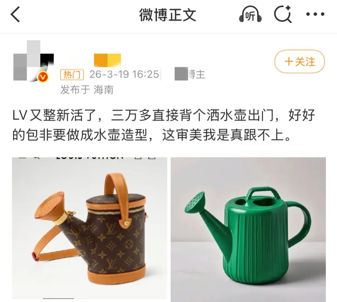 不同于LV以往经典沉稳的设计风格,这款“洒水壶包”走了小众异形路线,一经上市便引发讨论,有网友称:“LV又整活了。”
