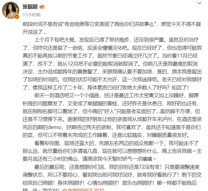 你有没有想过,当你在舞台上光芒四射时,身体却在悄悄抗议?最近张靓颖就给我们上了一课——四十岁的人了,居然因为带状疱疹、旧伤复发和手上干裂出血,不得不取消演唱会。这不是电影情节,而是真实发生在我们眼前的健康警报。