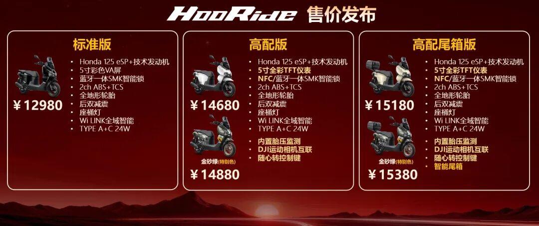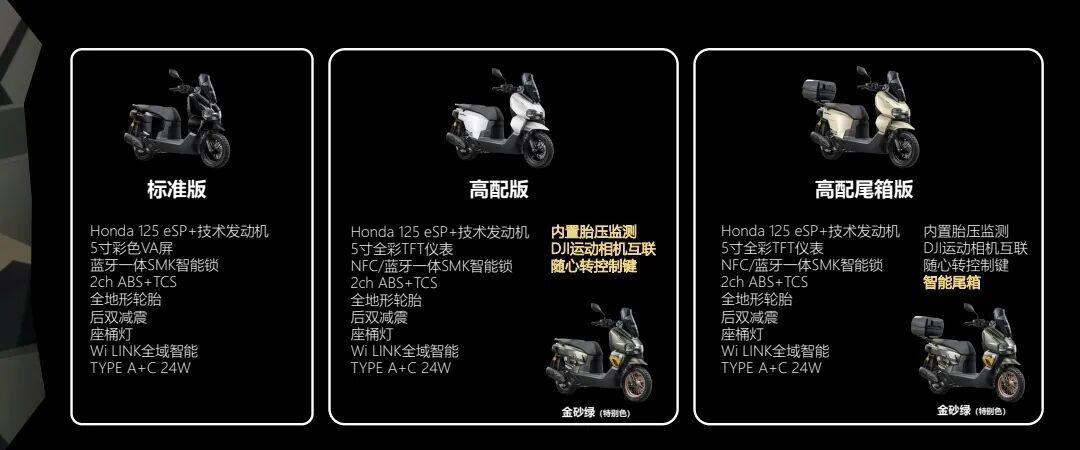 基础配置上本次HRD125共带来了三个版本的车型,但是大家无需担心的全系标配无钥匙启动、双通道ABS以及TCS牵引力控制系统,并且液晶仪表、24W双快充接口、Wi-Link智能互联、2段可调风挡、自动启停、ACG脉冲点火、双拉线油门也均为标配。