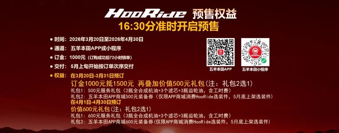 今天下午16:30,HRD125即正式开启预售。3月20日—3月31日之间,预付1000元定金即可抵1500元,并且还有500元的礼包叠加赠送。4月1日—4月30日之间,预定则只有600元礼包赠送,一直看好这台车的车友下手得快!