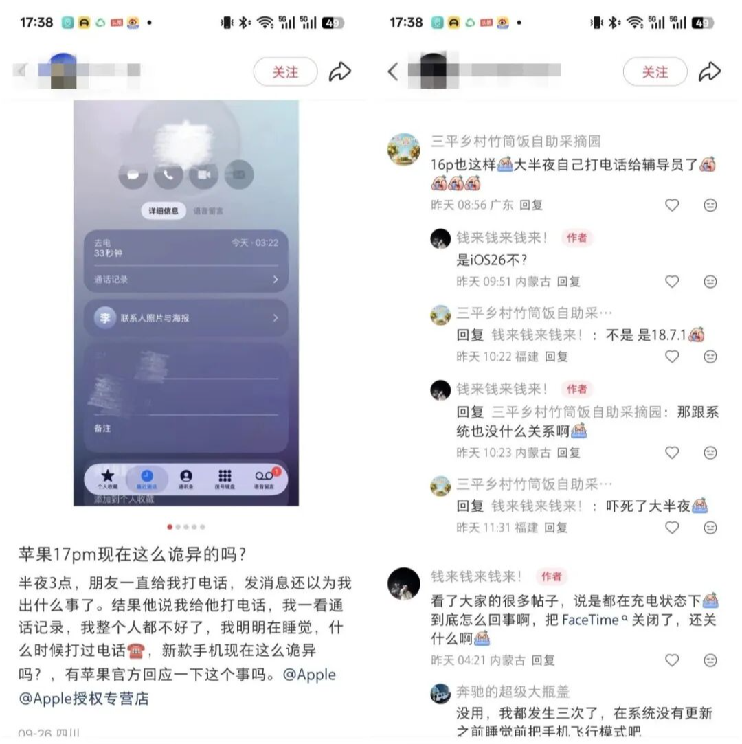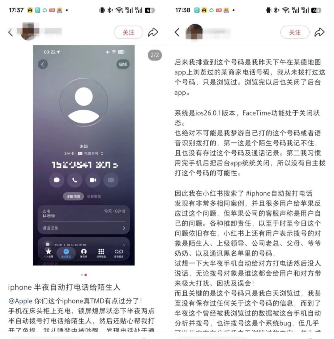 一位用户详细描述了自己的经历:凌晨三点左右,他的手机在无人操作的情况下自动拨打了一个他仅在网上浏览过的商家号码,并且还自动开启了免提功能。值得注意的是,该用户确认自己已关闭了FaceTime功能,系统版本也是最新的官方发布。