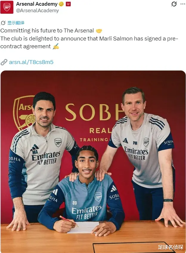 官方:阿森纳宣布萨尔蒙签下了一份预先协议,这意味着英格兰新星将在8月29日年满17周岁后签下职业合同。