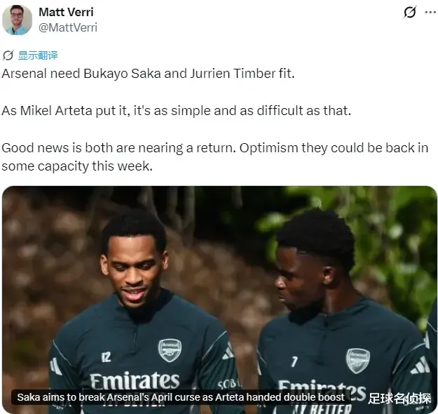 独立报主编MD也说萨卡预计会在一周内复出,好消息!