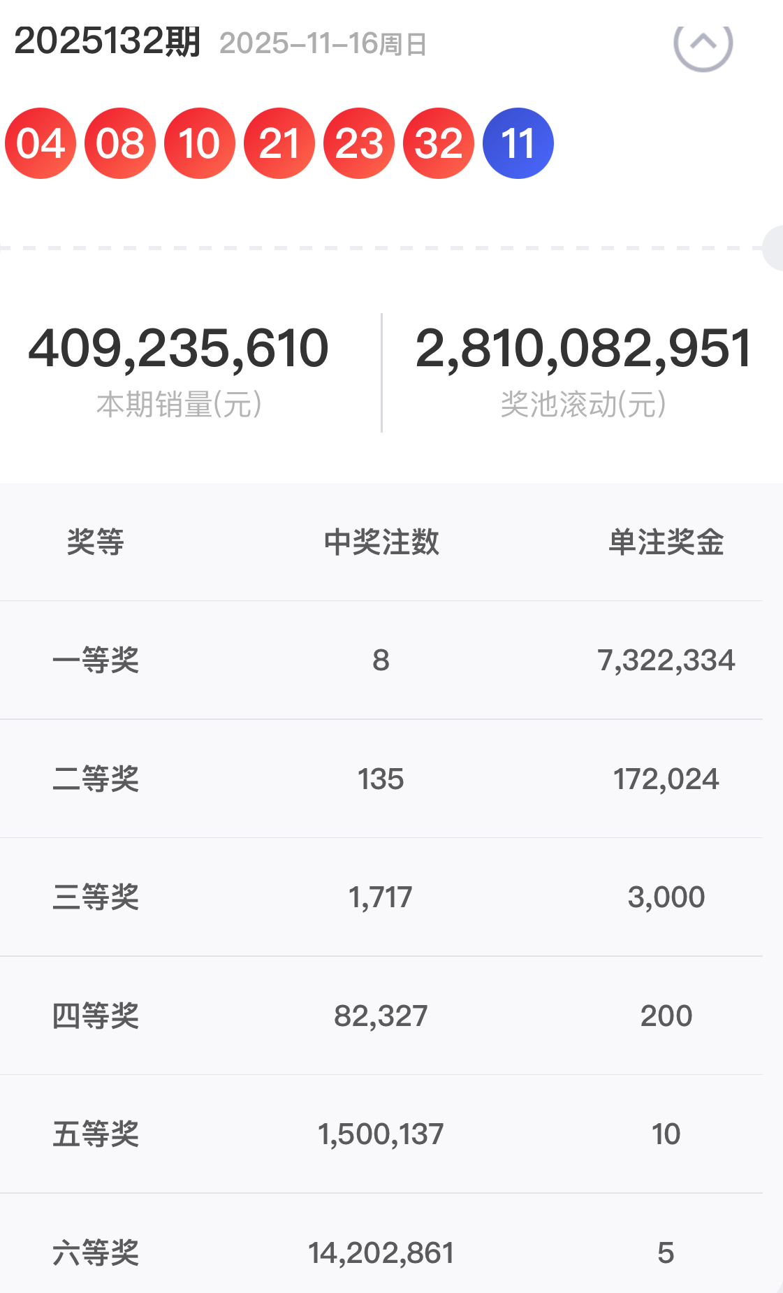 中国福利彩票双色球游戏②⓪②⑤132期开奖信息