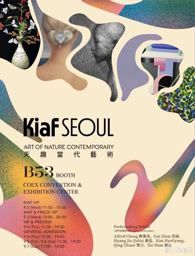 KIAF SEOUL 2025■ 天趣当代艺术展位:B53■ Kiaf VIP 预览:9.3(周三)11:00 - 20:00■ Frieze VIP 预览:9.3(周三) 15:00 - 20:00■ VIP & Preview:9.4(周四) 11:00 - 19:00■ 公众开放:9.4(周四) 15:00 - 19:009.5 - 9.6(周五至周六) 11:00 - 19:009.7(周日) 11:00 - 18:00■参展艺术家:Alfred Cheng、范祯、黄佳、Kim HyeGyung、青川、谢山(以姓名首字母排序)■ 展览地址:韩国COEX首尔会议中心