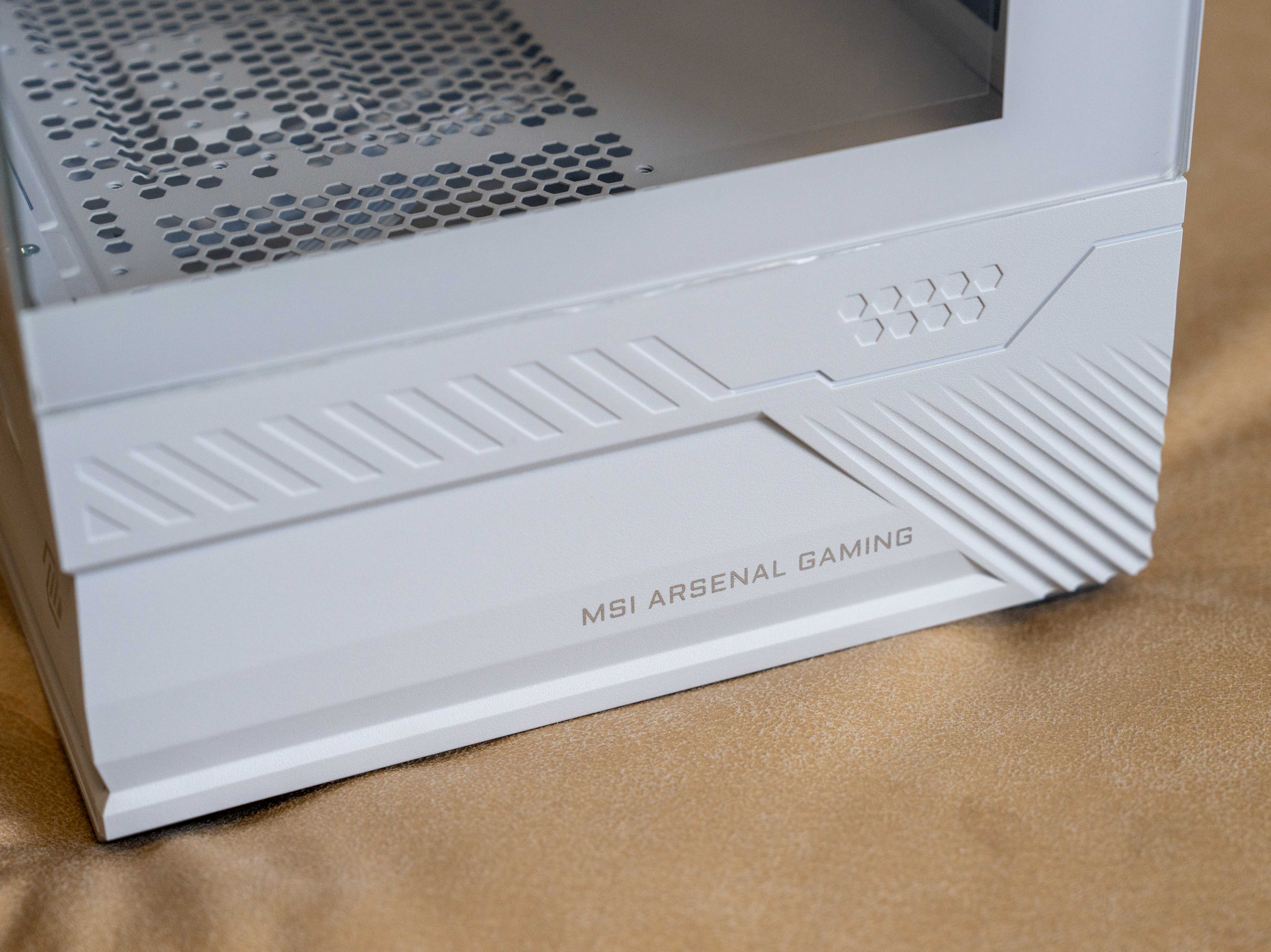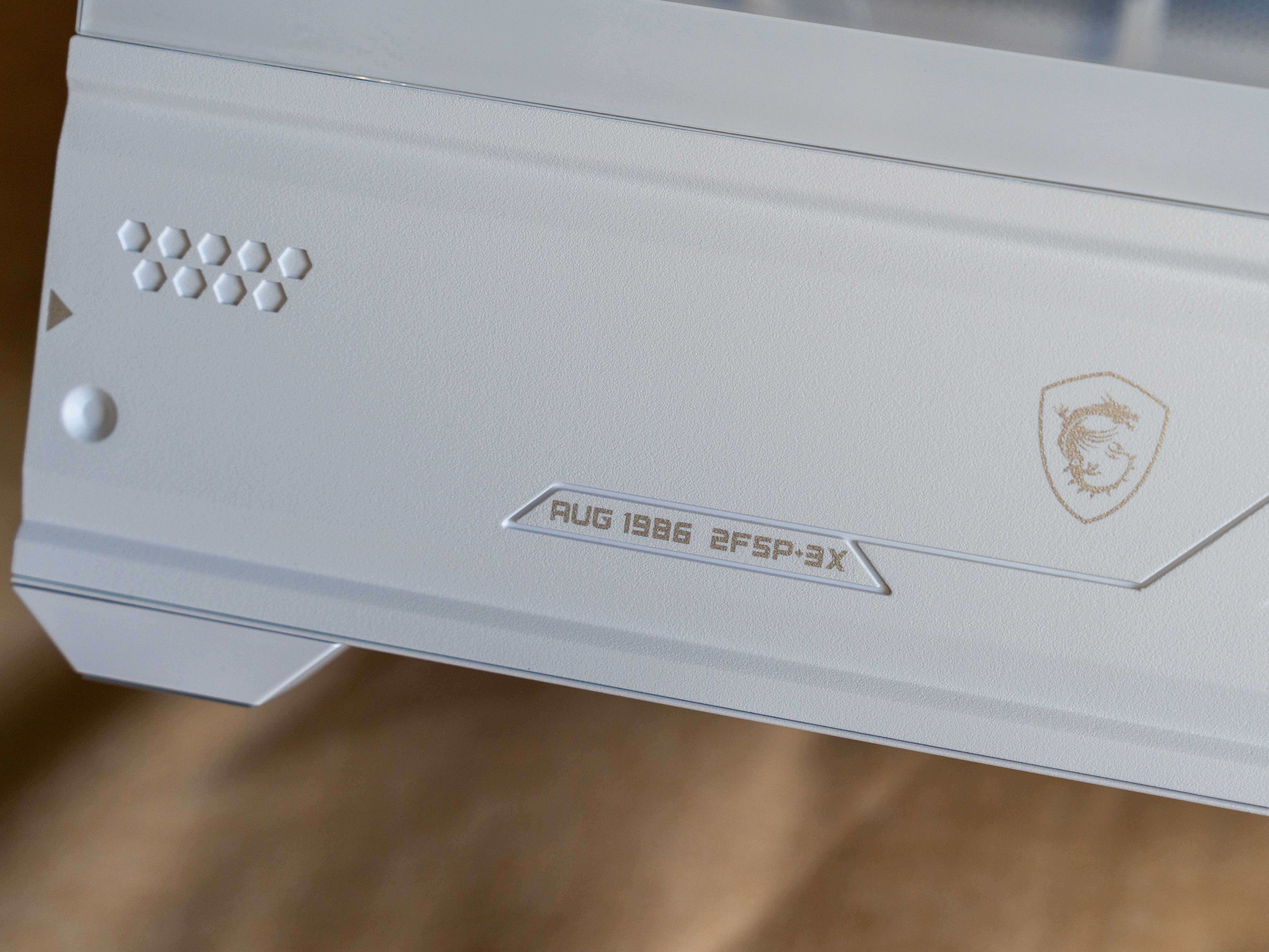 微星的龙盾标识印在电源仓侧面,一眼就能认出是微星家族的成员。机箱表面做了不少斜纹和六角纹装饰,线条利落,视觉上比普通平板的机箱更有层次感。