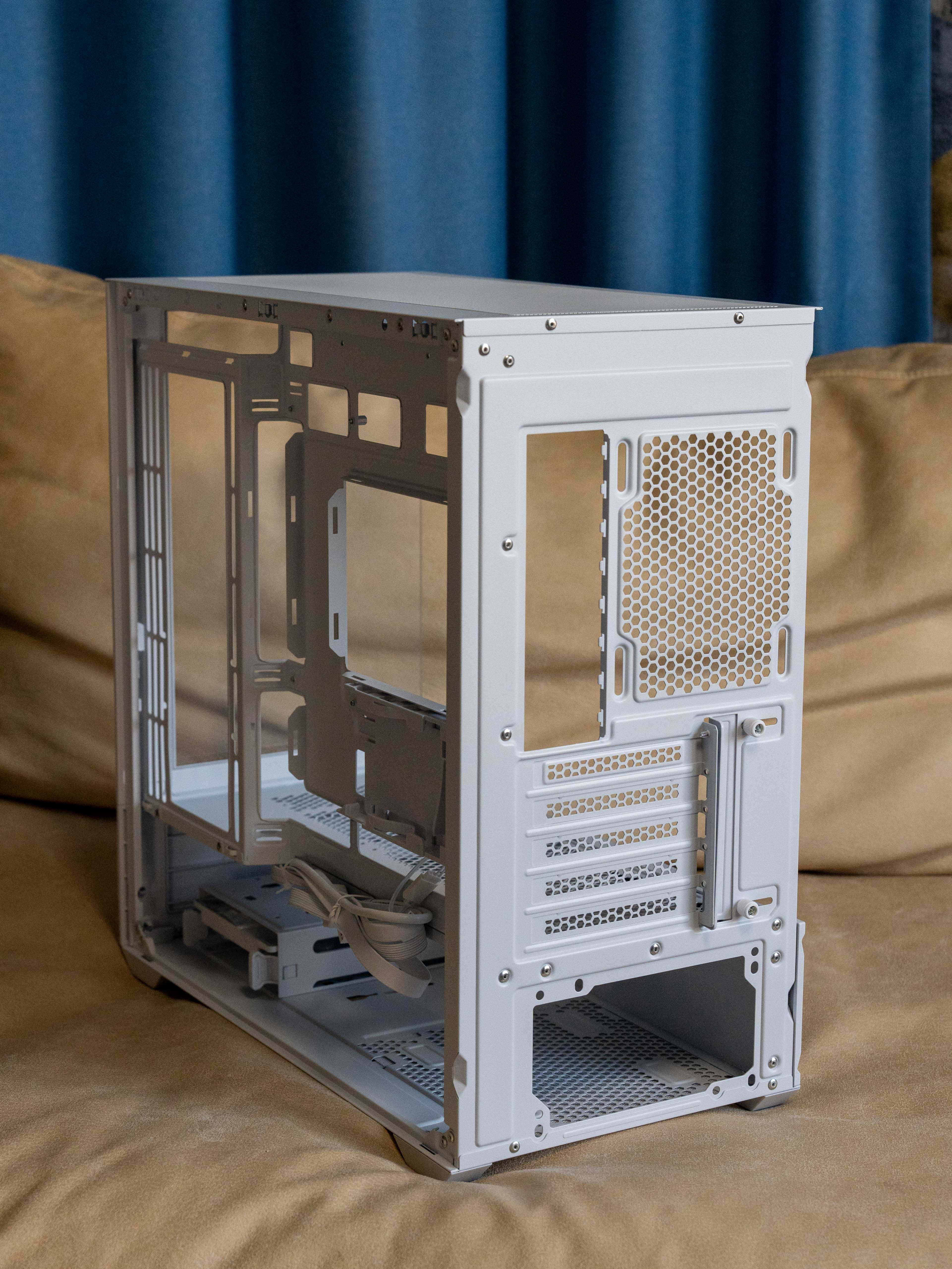 背面提供五个PCIe槽位,支持多显卡或扩展卡安装。顶部预留了一个120风扇位,出风口做了凸起设计,避免扇叶和防尘网摩擦。背面整体结构紧凑,但该有的接口和散热开口一个不少。