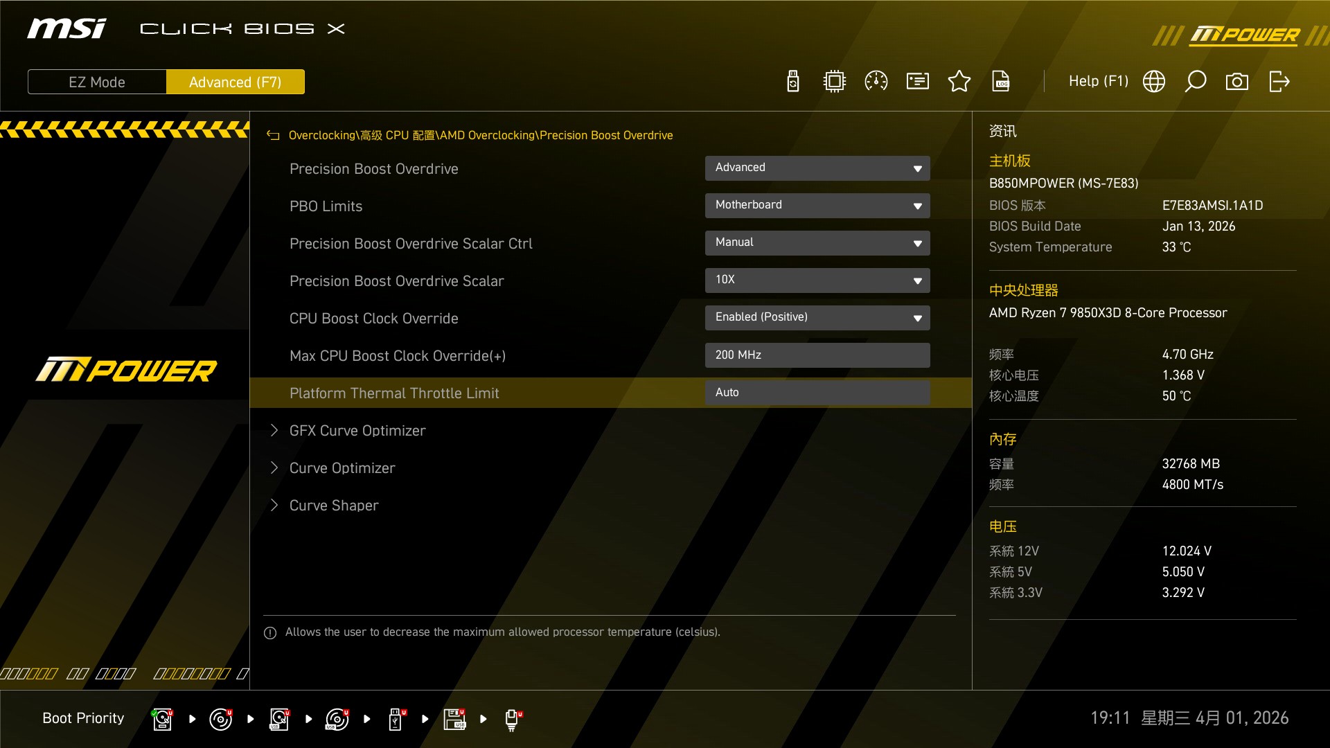 装机完毕,我们先通过微星B850MPOWER主板解锁这套配置的潜力。在高级模式的PBO界面下直接手动PBO,有需要的朋友可以直接抄作业。