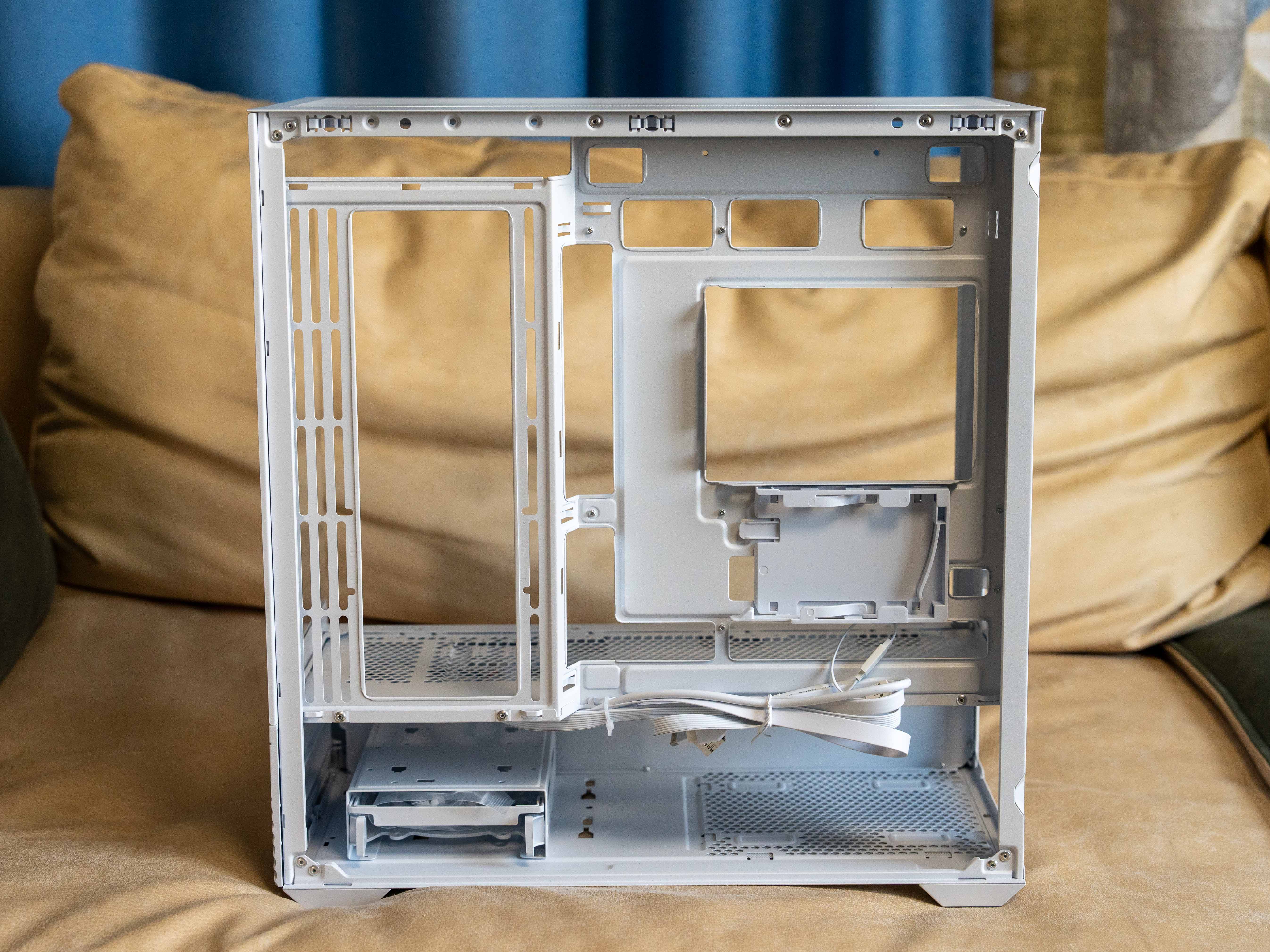 我们再来看右侧面,拆掉侧板后背部理线空间一目了然。预留的走线槽和理线卡扣很充足,配合附赠的魔术贴,能把电源线和各类信号线整理得干干净净。电源仓采用贯通式设计,线材可以轻松收纳,不会挤占其他空间。