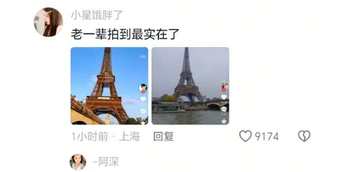 异域风景在大家心里总带着一层“光环”,觉得国外的一切都比国内好。但现在,大家能轻松把埃菲尔铁塔比作“电线塔”,把塞纳河戏称为“村头水沟”,这份调侃不再盲目崇拜国外的风景,而是能用自己熟悉的审美去理解世界,这恰恰是文化自信的体现。