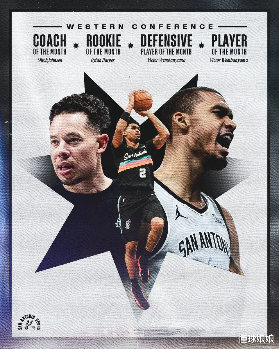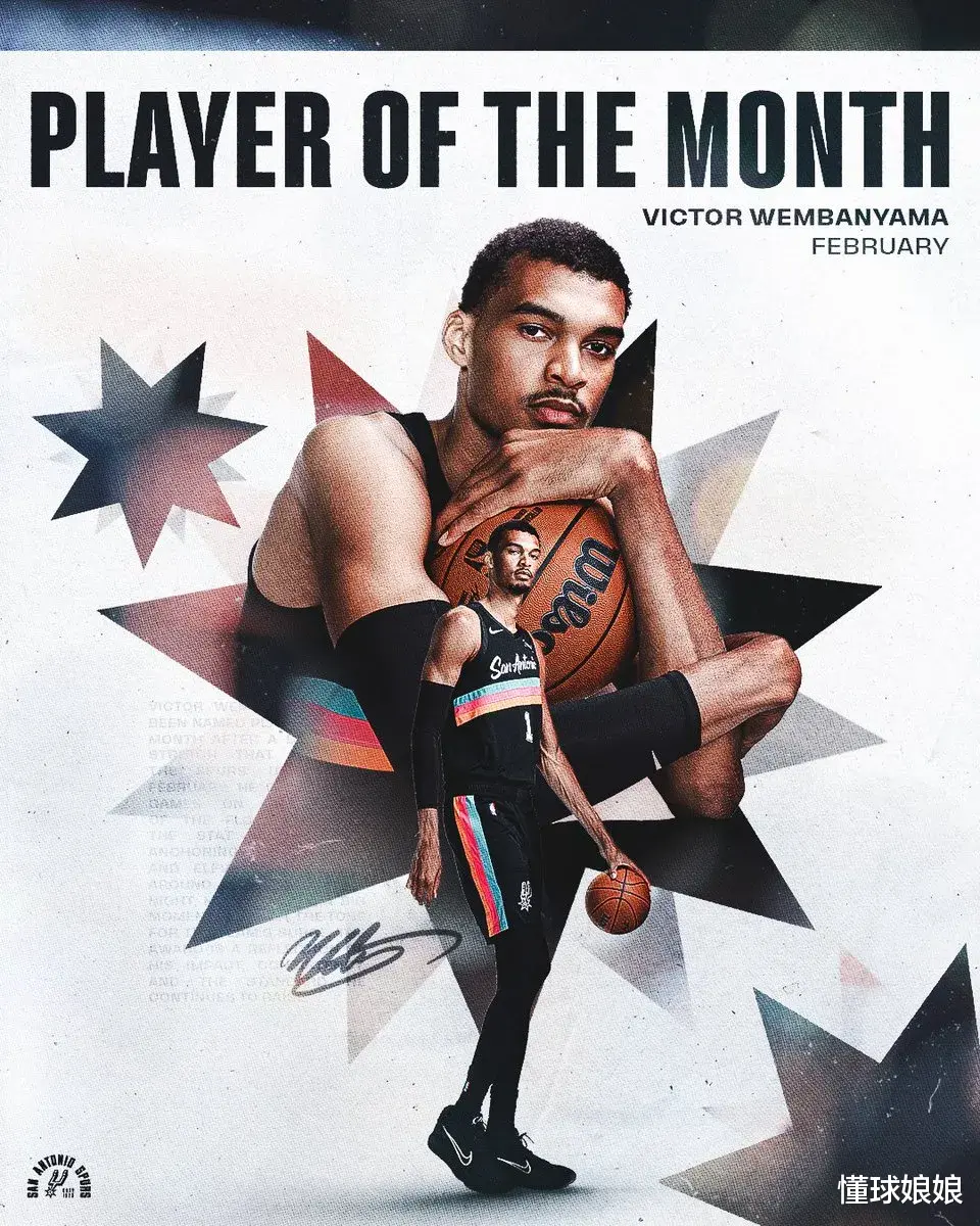 最佳球员……文班亚马单月场均22.5分11.3板3.5帽,球队战绩11胜0负。这是文班生涯第一次拿到月最佳球员呢,有了这个第一次,未来应该会有无数次。