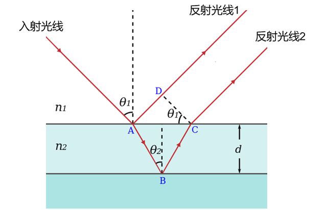 关键就在于这次相遇叠加,这个过程在物理学上被称为光的干涉。这个过程就像两束相干光波在进行一场“对话”——当它们“达成共识”(相位相同)时,就会相互增强,形成明亮的条纹;而当它们“意见相左”(相位相反)时,则会相互抵消,产生暗淡的区域,如图3所示。而它们为什么会具有“不同的意见”(不同的相位)呢?从图2可以看到,AB+BC是光线2穿过薄膜的距离,AD是光线1在空气中行进的等效距离,两者之差就是光程差,即相位差的来源。