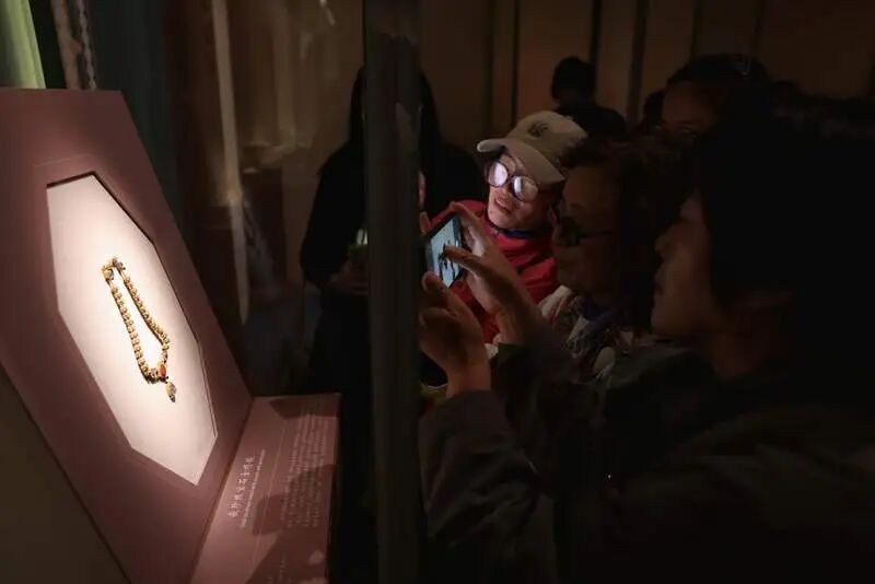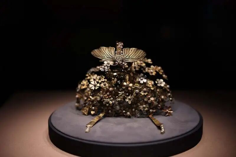 展出宝石金项链和闹蛾金钗