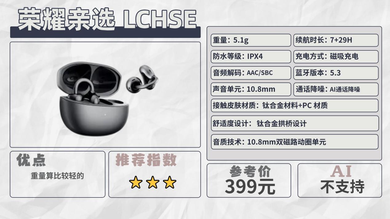 推荐二:荣耀亲选LCHSE(399元)推荐指数:⭐⭐⭐机型亮点:三频均衡,中高频有层次感