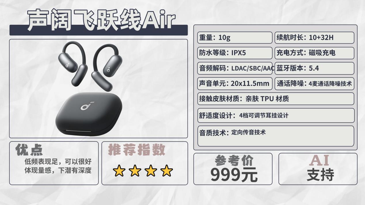 推荐七:声阔飞跃线 Air(999元)推荐指数:⭐⭐⭐⭐机型亮点:开启音效会有氛围感