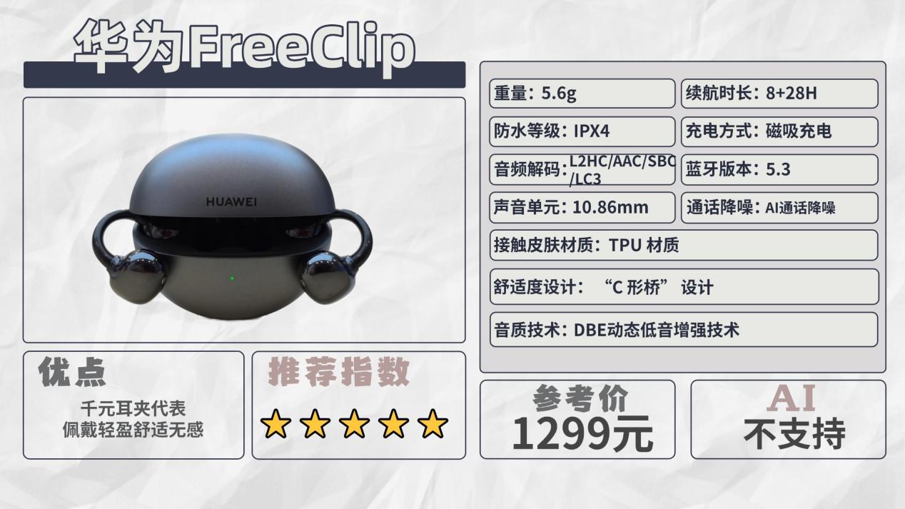 推荐十:华为FreeClip(1299元)推荐指数:⭐⭐⭐⭐⭐机型亮点:蓝牙连接稳定快捷,支持华为设备流转