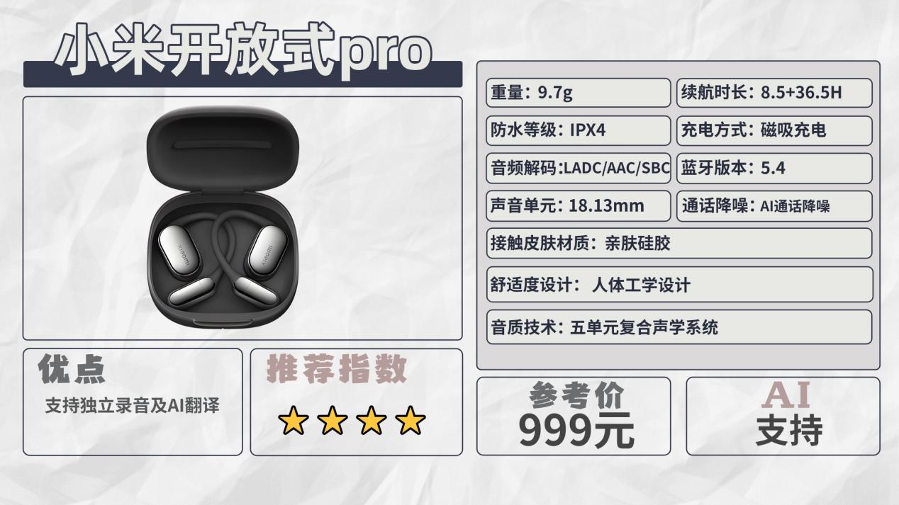 推荐八:小米开放式耳机Pro(999元)推荐指数:⭐⭐⭐⭐机型亮点:低频表现突出,人声清晰度高