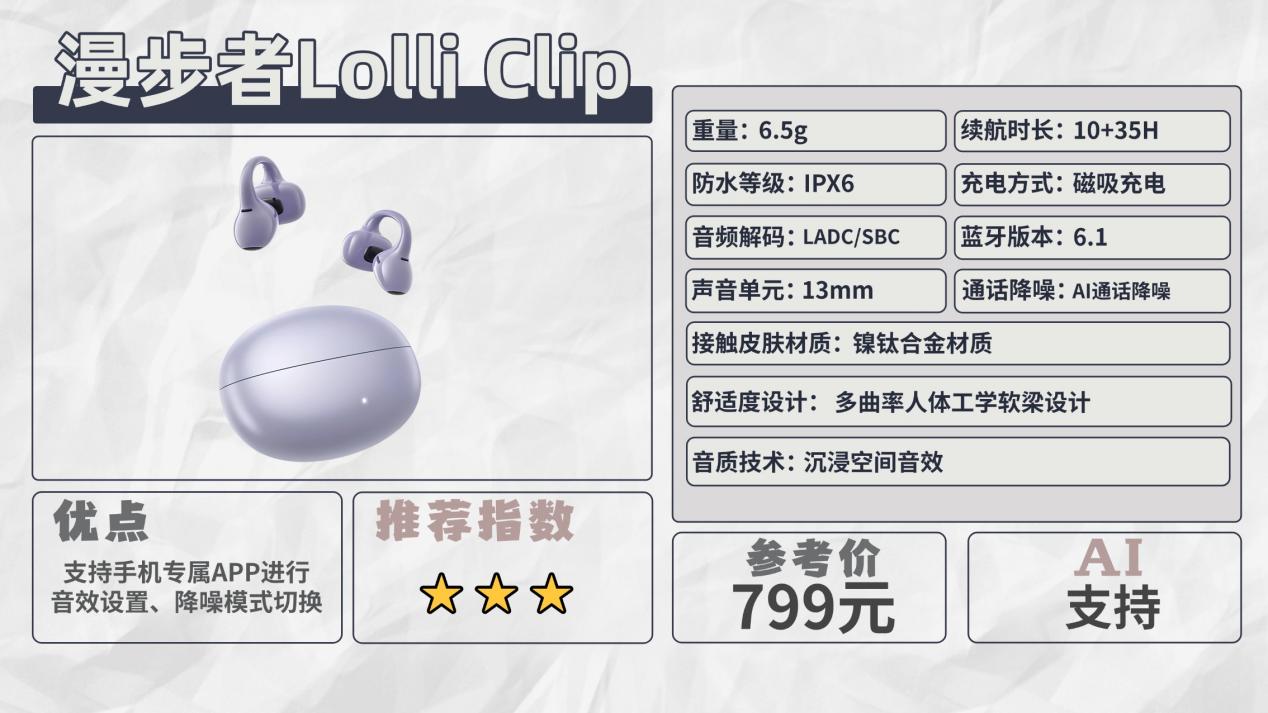 推荐三:漫步者Lolli Clip(799元)推荐指数:⭐⭐⭐机型亮点:适合运动党,可以监测心率血氧