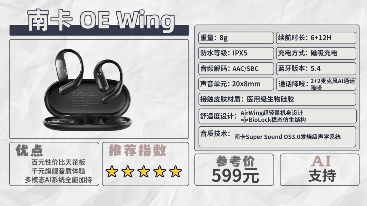 推荐一:南卡OE Wing(599元)推荐指数:⭐⭐⭐⭐⭐机型亮点:舒适与音质双料王者,行业最强发烧配置,常年霸榜销量口碑第一!