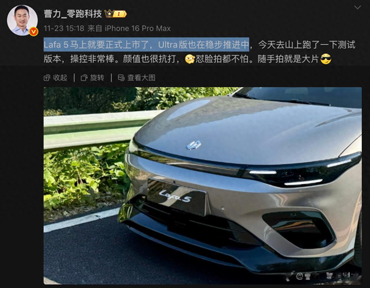 近日,零跑汽车高管在社交媒体上市透露了Lafa5 Ultra版的实车图片,引发了市场对这款新车的广泛关注。根据目前已披露的规划,Lafa5车型将于11月27日正式上市,目前的预售价为10.58万元起,而此次曝光的Ultra版将作为性能版车型,预计在2026年第二季度推向市场。
