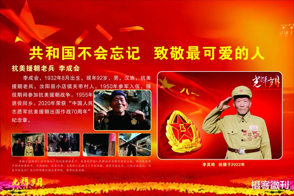 在小店镇关帝村,93岁的老兵李成会老人穿上了崭新的军装,李成会爷爷 1953 年退伍,曾荣立三等功,2020 年获 “中国人民志愿军抗美援朝出国作战 70 周年” 纪念章。当摄影师把镜头对准老人时,他突然挺直腰板,用略带颤抖的声音唱起《中国人民志愿军战歌》:“雄赳赳气昂昂跨过鸭绿江……”